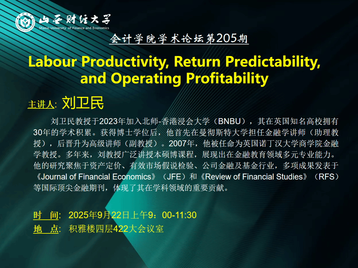 学术论坛第205期邀请了北京师范大学-香港浸会大学联合国际学院刘卫民教授做学术报告《Labor Productivity, Return Predictability, and Operating Profitability》。高宁教授、李颖副院长、青年科研骨干教师及硕博研究生共同参与,围绕劳动生产率与企业股权估值、股票回报的关联展开深入探讨。