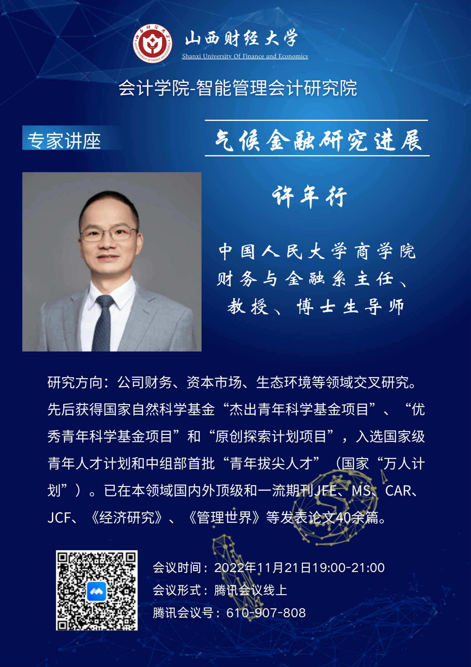 -智能管理会计研究院以线上会议的形式邀请了中国人民大学许年行教授做专题讲座。许教授的报告题目为《气候金融研究进展》。