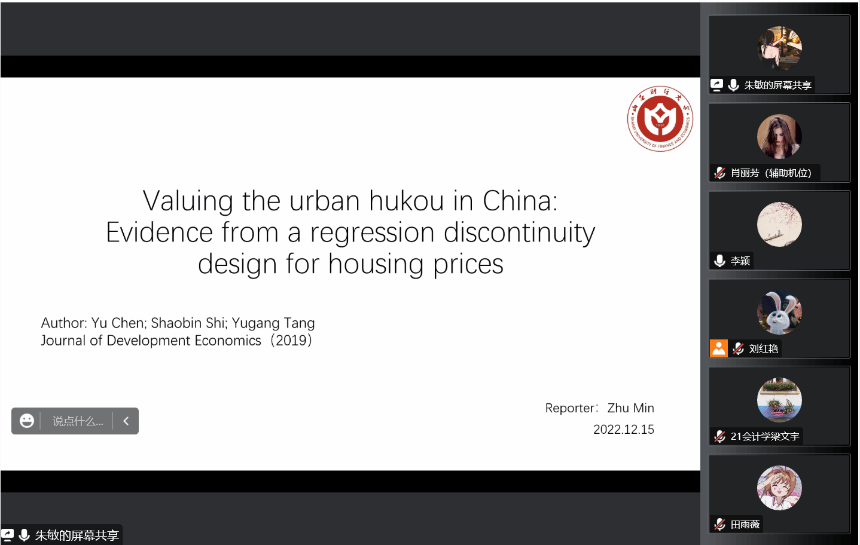 在研究方法分享环节,朱敏硕士分享了文章《Valuing the urban hukou in China: Evidence from a regression discontinuity design for housing prices》的主要内容。林嘉安老师重点讲解了断点回归设计的运用,并耐心解答了刘红艳博士等同学的问题。