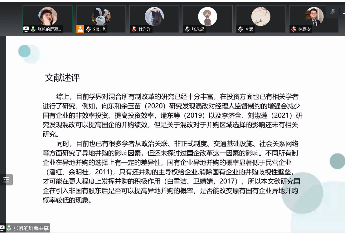 工作论文分享环节,张帆硕士分享了工作论文《国企混改与异地并购》。赵毅老师指出:混合所有制改革范围大,表述不清晰;逻辑链条不清晰,建议多看实务界方面有关混合所有制的书籍,明白其中的理论逻辑。曹燕明老师指出:国企混改对异地并购经济后果影响有待指出;理论假设部分可以适当增加企业并购法律流程,着重关注混改在并购决策流程的影响方面;实证方面,样本处理过程未列明,存在内生性问题,工具变量的选取不合理。