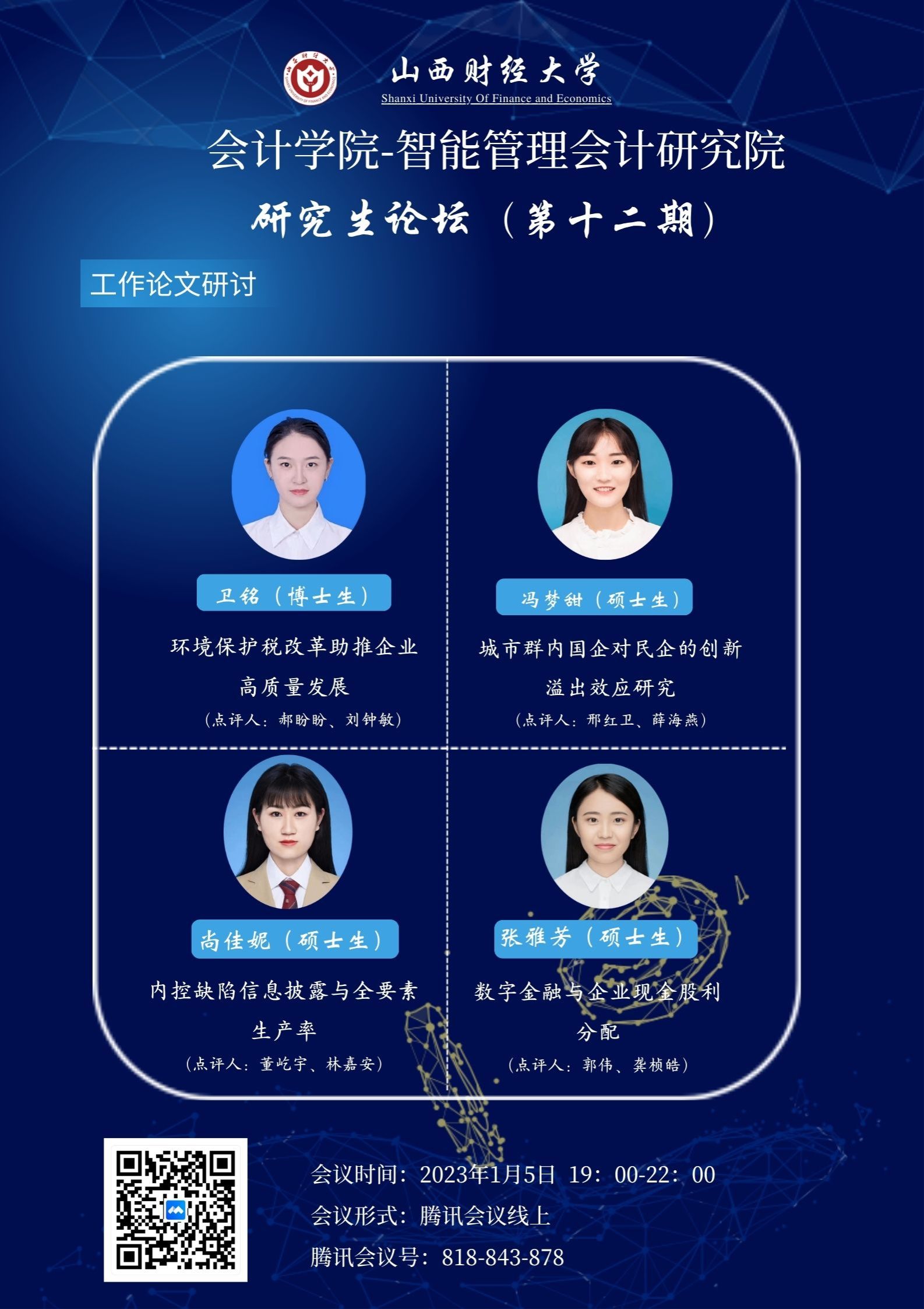 与智能管理会计研究院联合举办的研究生论坛第十二期以线上会议的形式举行。会议由李颖教授主持。参会人数达八十余人。本次学术沙龙活动研讨了四篇工作论文。