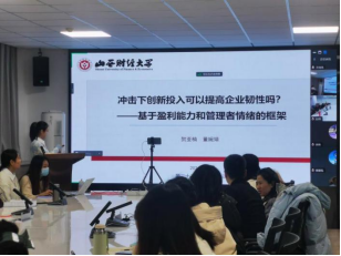 硕士研究生董婉婧同学汇报自己的工作论文,题目为《冲击下创新投入可以提高企业韧性吗?——基于盈利能力和管理者情绪的框架》。