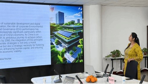 国际博士留学生Rabia汇报工作论文,题目为《Sustainable Growth in the Digital Age Exploring the Impact of ESG Practices on Human Capital Investment Efficiency in Chinese Enterprises》。高宁教授认为关于变量的选取,如何更好地解释Human Capital与ESG之间的关联还需要进一步的研究;还需要恰当的ESG指标更好地描述企业中的labor相关指标。林振聘教授建议可以同时选择中国和印度的数据做对比。