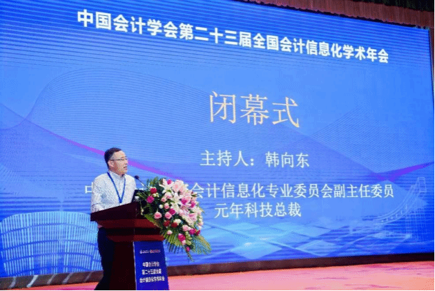 大会闭幕式由中国会计学会会计信息化专业委员会副主任委员、元年科技总裁韩向东主持。6篇学术论文入选年会优秀论文。会计信息化专业委员会主任委员、东南大学陈志斌教授对大会进行总结并进行了会旗的交接仪式。据悉,下届年会将由北京工商大学承办,同时也将在山东财经大学开展相关学术交流活动。