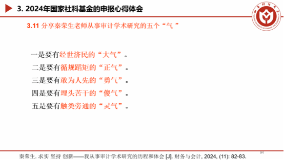 最后,上官泽明副教授分享了秦荣生老师从事审计学术研究的五个“气”,与会师生深受启发与鼓舞。