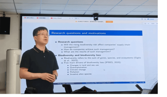 师生带来了一场题为《生物多样性与企业供应链》的学术报告。高教授通过对生物多样性政策及其影响的解析,深入研究了企业如何通过调整供应链组成来应对生物多样性的转型风险,同时探讨了供应链调整的利弊。报告内容丰富,视角独特,引发了在场师生的热烈讨论。