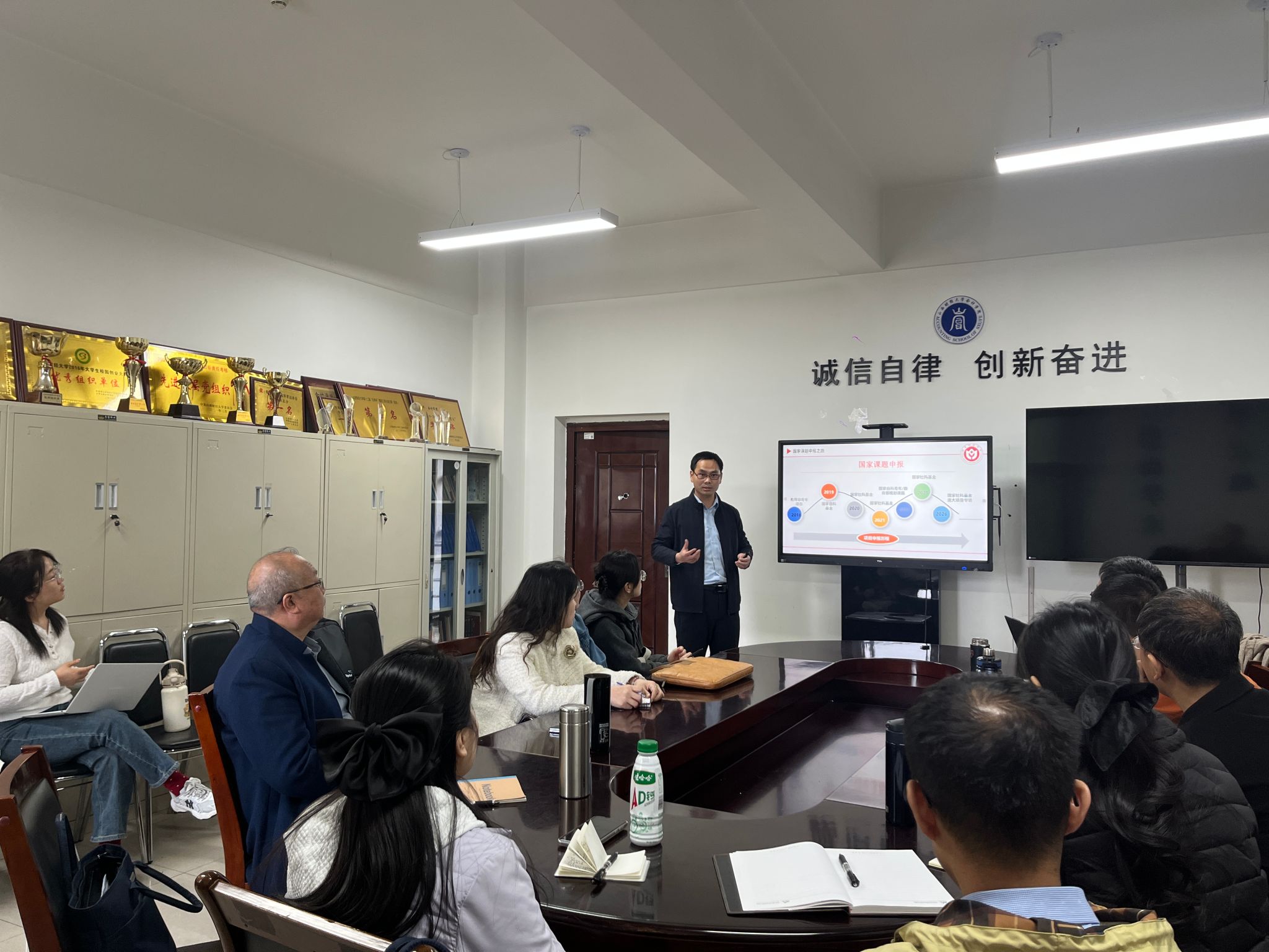 小会议室举行。学院20余位科研骨干教师参加了论坛。论坛分两个阶段进行,第一阶段由黄贤环教授结合自身国家课题的申报经历,围绕为什么要申报国家课题、申报什么国家课题、怎么申报国家课题以及国家课题申报反思等四个方面进行了深度分享。第二阶段由贺亚楠教授汇报本年度国家社科基金申报书。与会教师围绕选题、研究内容设计、变量测度、问题导向性等方面展开了深入的研讨。本次学术论坛使参会教师对国家社科基金申报有了更清晰的认识,同时对学院教师国家课题申报书进行了更好地孵化。
