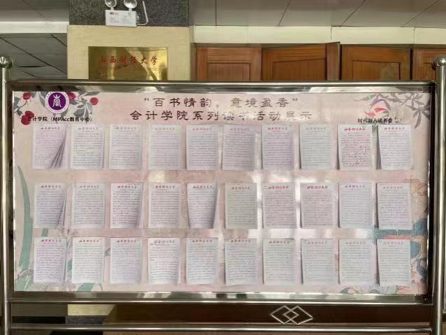 20244月,独播库 举办的第七届百书情韵 意境盈香读书系列活动成功举办,遴选出了一批优秀作品于第29个世界读书日当天在立信楼二层大厅展出。一经展出,就引来众多学生参观,纷纷驻留在展板前学习交流,吸引更多的同学加入到读书的行列中去。