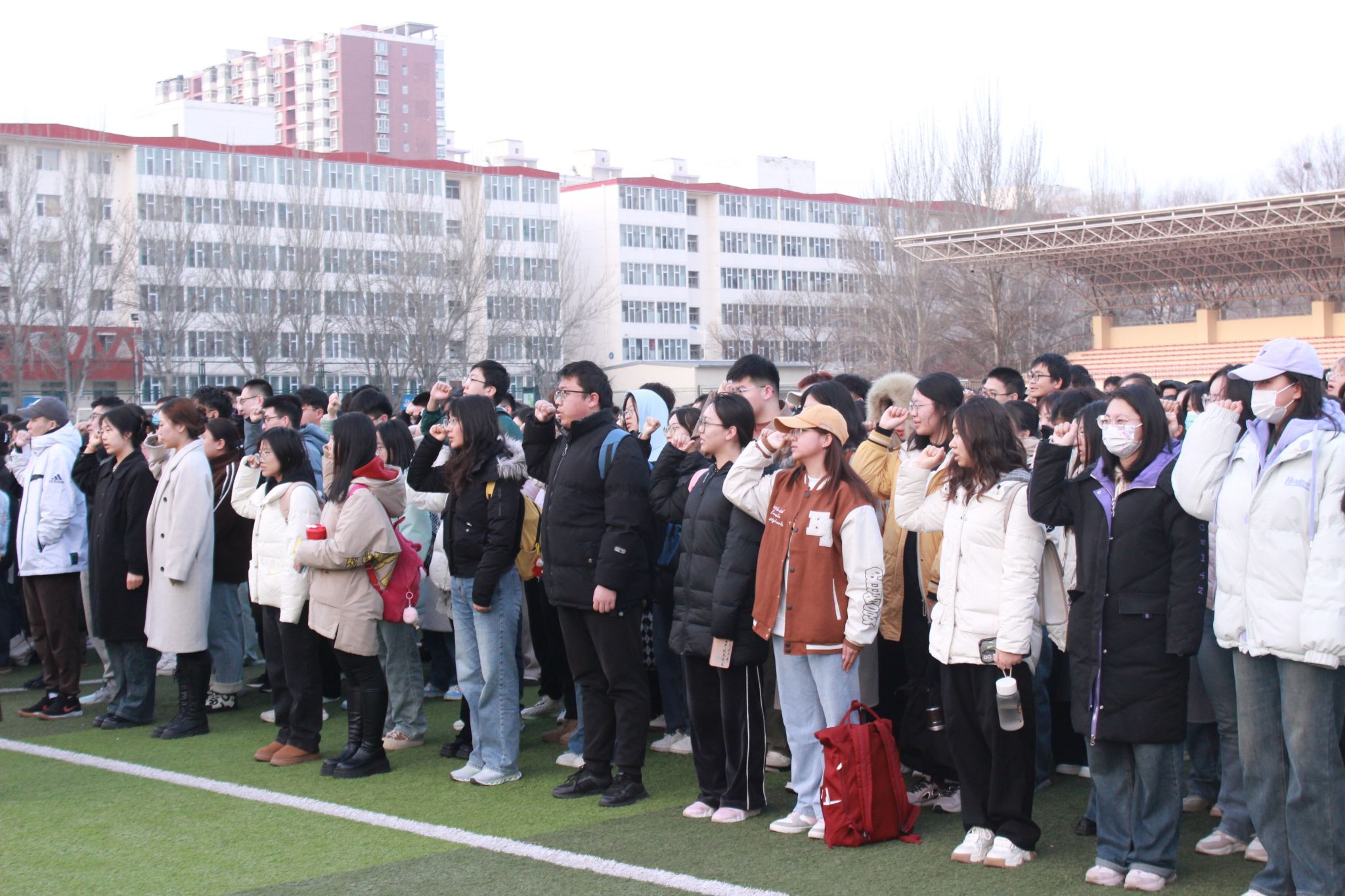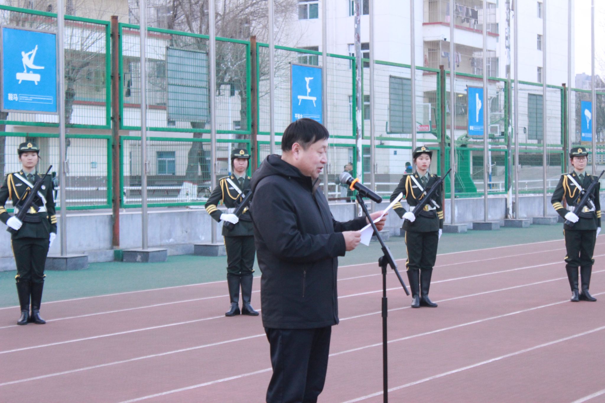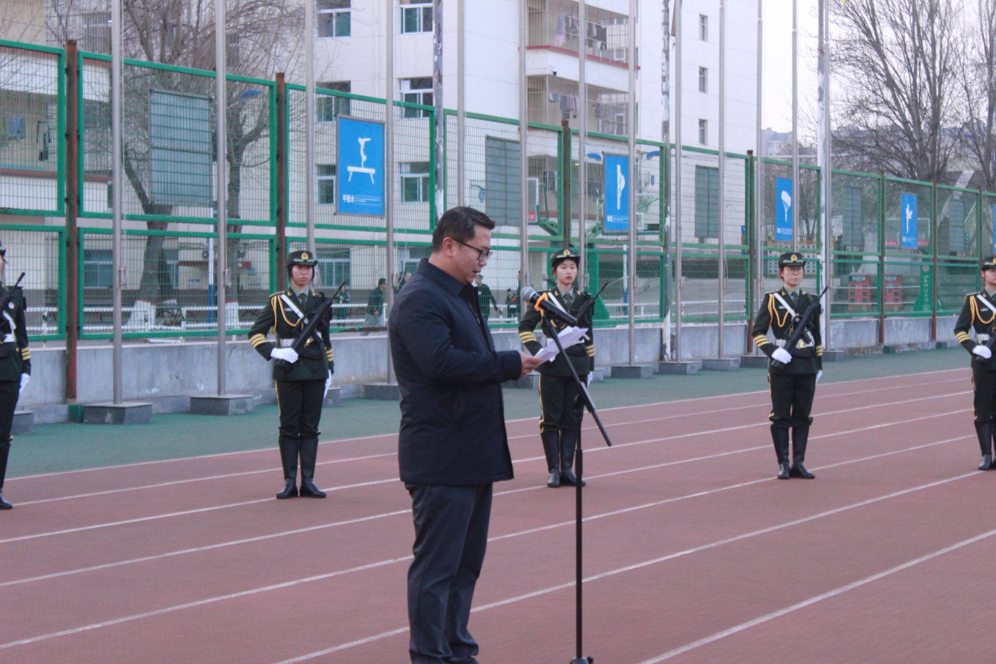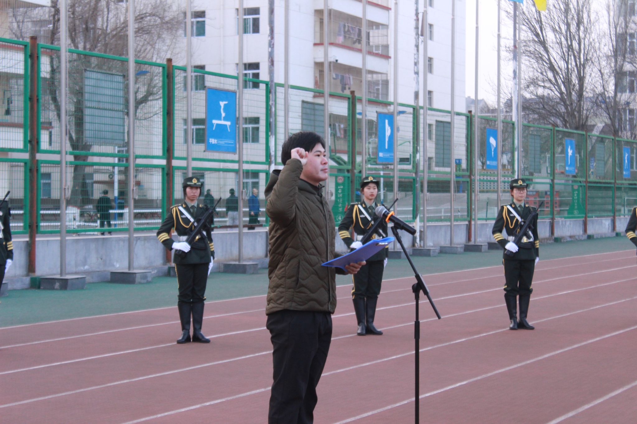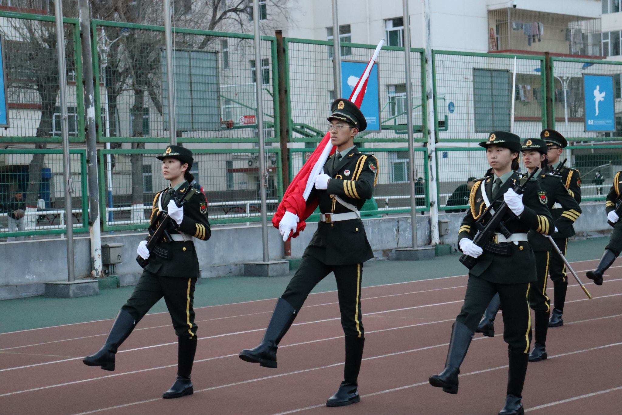 在坞城校区体育运动场举行升国旗仪式。学院领导班子成员、全体辅导员、全体在校学生参加活动,学院党委副书记赵骞主持仪式。